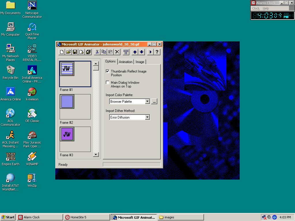 - Load your pages with GIFs to keep the user engaged. If you're a beginner, you can download free GIFs from GeoCities. If you know what you're doing, you can create your own GIFs using Microsoft GIF Animator.