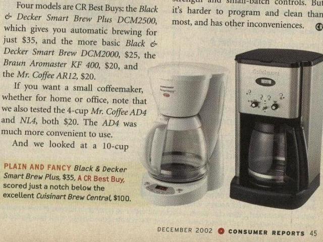 I have been looking for a new coffee maker for some time now, and I think I have found the one. Consumer Reports magazine describes the Black&Decker SmartBrew Plus DCM2500 as "Very good, with good price and features. 12cups. Long cord, w/storage. Tested model sold primarily at Kmart." I ordered it today, it should get here a week from now.
