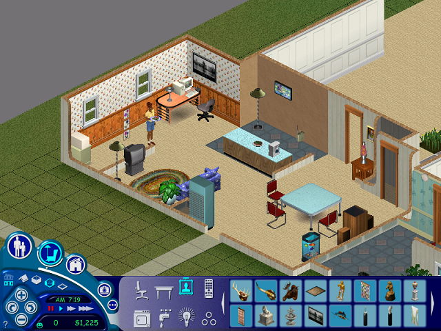 This roughly replicates my office layout. I use The Sims whenever I want to visualize what a future project might look like. In this case, my next project is carpet, and since I have to move everything out of the office to lay the carpet, I figured I would explore different layout options. Using The SIms, I can move the furniture around, rearrange the room as I please, and see what works and what doesn't. I guess you could say I'm an architect. If web design, GIFs, and site maps ever go out of style, I know where to go next.